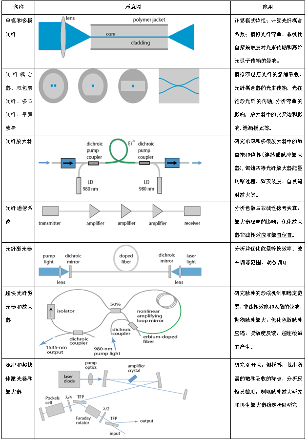 可以設(shè)計(jì)并優(yōu)化光纖激光器和放大器、光波導(dǎo)激光器、光纖耦合器、多芯光纖、螺旋芯光纖、錐形光纖;也可以模擬超短脈沖在不同光纖設(shè)備中的傳輸,例如在光纖放大器系統(tǒng)、鎖模光纖激光器和通訊系統(tǒng)中的傳輸。
