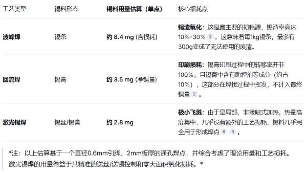 為了直觀展示差異,這里以一個(gè)典型的通孔插件元件為例,對(duì)三大工藝的錫料消耗進(jìn)行量化對(duì)比: