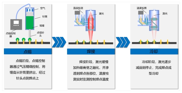 錫膏激光焊接:預(yù)先在焊盤上涂覆錫膏,再通過激光加熱實(shí)現(xiàn)焊接。該方式便于與印刷電路板高密度組裝及 SMT 工藝集成。